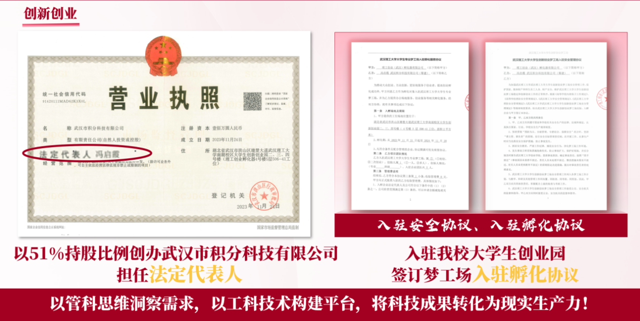 科研之初,缺乏经验的冯启霞好奇又畏惧,但身边朋辈的扶持与师长的鼓励,让她勇敢迈出第一步。面对数据未整合、创造力无发展、资源未汇聚等问题,她以管科思维洞察需求,以工科技术构建平台,文武结合将科技成果转化为现实生产力。她创新性提出高校双创教育数字平台“火箭”模式,目前平台一代已经上线,注册用户达2000人,销售额超6000元。为了巩固创新创业成果,冯启霞以51%持股比例创办武汉市积分科技有限公司,并担任法定代表人,该项目通过答辩考核成功入驻我校大学生创业园。在创新创业的过程中冯启霞还加入了一支船海赌场老虎机 的科创项目团队,作为负责人的她与队员一起伴着凌晨三点的校园讨论方案,一起在余家头创业赌场老虎机 103刷夜通宵,一起每天往返于南湖和余家头两大校区……几月深潜,黄牛耕耘,终于换来了中国国际大学生创新大赛国家银奖的滚烫奖杯。